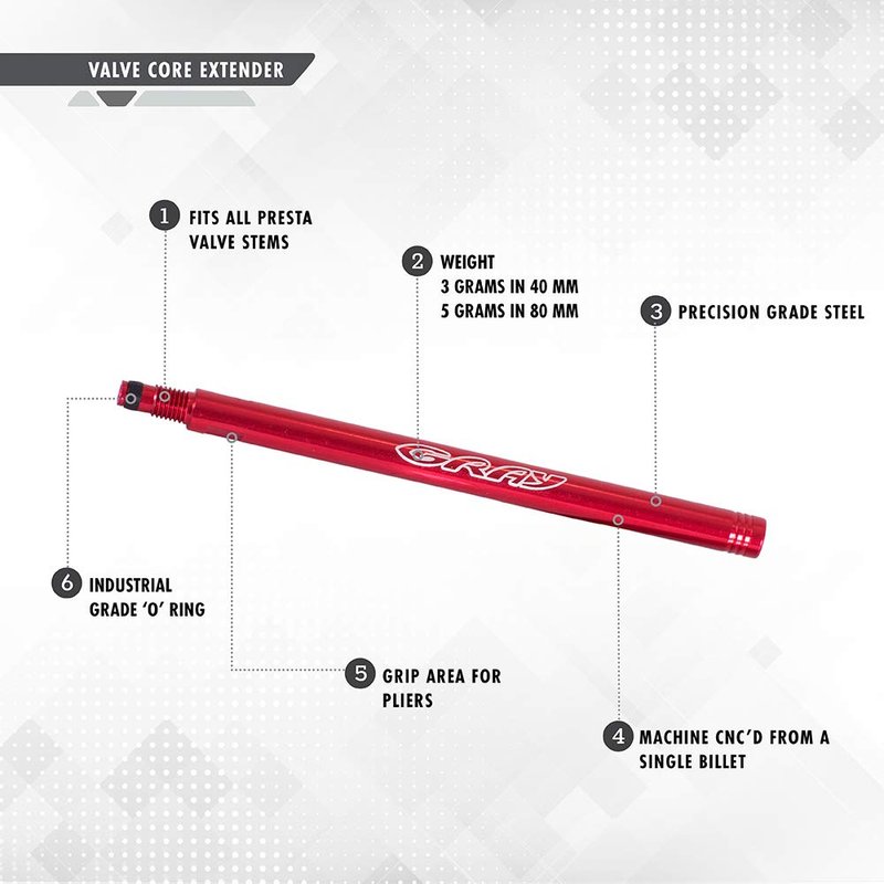 Instructions: Inserts between valve body and valve core, making inflation and deflation very easy. Make sure that you open up the existing valve on the tire all the way and that you do not close it again, when you screw on the extension. Sometimes using Lock-Tight can be helpful to achieve a perfect seal, if your existing valve is worn. Aero and deep dish aero rims require that you use a longer stem Presta valve. All Gray wheels come standard with valve extenders, but if you need more, here you go. Available in variety of lengths to specifically compliment GRAY Wheels. Available lengths rim compatibility: 35 mm for 5.0 and 45WLX, 45WLC wheelset / 70 mm for 9.5 and 80WLC wheelsets