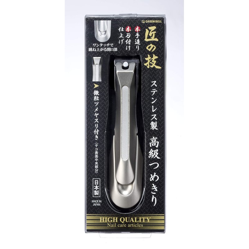The G-1205 Stainless Steel Nail Clipper is from the high quality Takumi No Waza line of grooming implements by Green Bell of Japan. The G-1205 embodies the Japanese dedication to fine craftsmanship. Good for men and women alike, it's smooth ergonomic design fits comfortably in your hand. Its size is perfect for toenails but can also be used on fingernails. Made of hardened stainless steel and lever made of zinc alloy. A nail file is conveniently built into the top of the lever. Its expertly ground twice sharpened edges cut nails effortlessly. You will enjoy using this nail clipper again and again. Green Bell nail clippers are often imitated but the quality can not be matched.