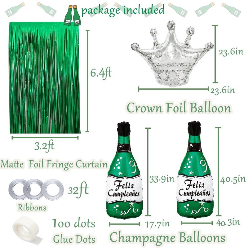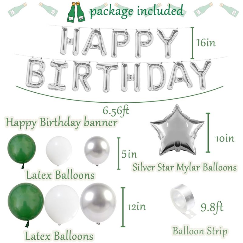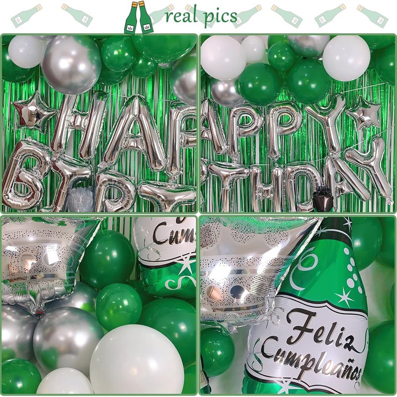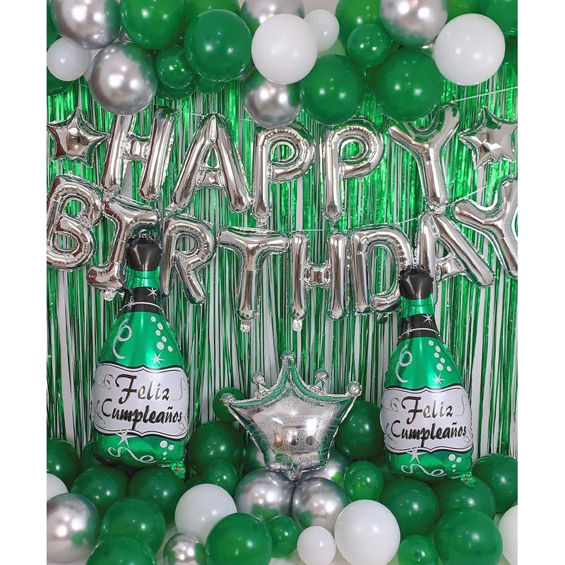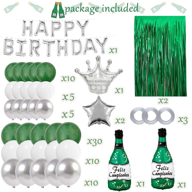 Green Birthday Party Decorations with Silver Happy Birthday Banner, White, Green and Silver Balloons Dark Green Champagne Balloon, Green Foil Fringe Curtain for Men Women Girls Boys Party Decor Supplies Package Includes: 1 PC Silver Happy Birthday Balloon Banner 40 PCS Emerald Green Balloons 15 PCS White Latex Balloons 15 PCS Silver Latex Balloons 2 PCS Silver Star Mylar Balloons 2 PCS Green Foil Fringe Curtain 1 PC Green Champagne Balloon 1 PC Forest Green "feliz cumpleanos" Bottle Balloon 1 PC Silver Crown Balloon, 1 PC I6.4ft Balloon Strip 1PC Glue Dots and 3 PCS Ribbons