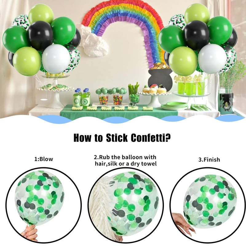 Our Green and White Balloons set offers a captivating color palette. The vibrant green balloons symbolize growth and vitality, while the black balloons add a touch of mystery and contrast. The white confetti balloons create a playful and festive element, adding an extra dose of joy to your decorations. The dark green and lime green balloons further enhance the overall visual impact, bringing a fresh and energetic atmosphere to your special event.