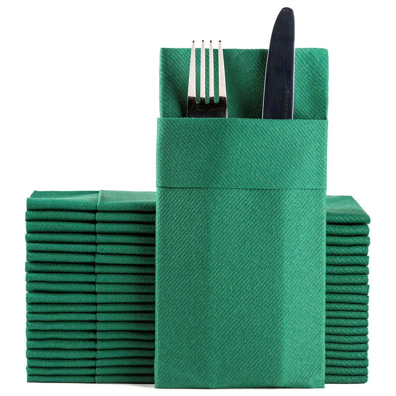 Green Dinner Napkins Cloth Like with Built-in Flatware Pocket, Linen-Feel Absorbent Disposable Paper Hand Napkins for Kitchen, Bathroom, Parties, Weddings, Dinners or Events, 1/8 Fold, Pack of 50