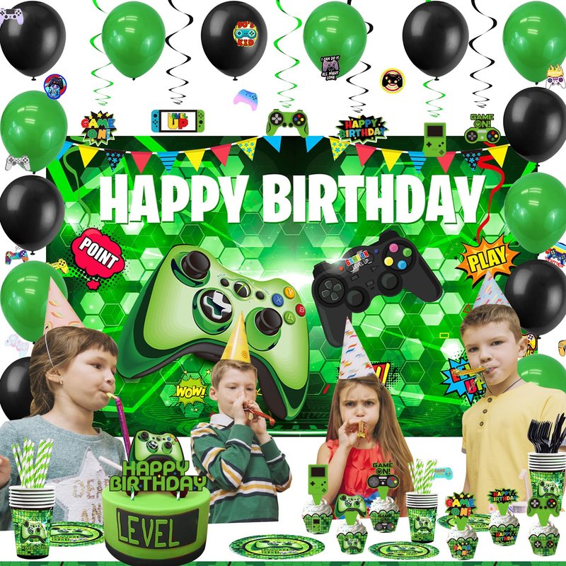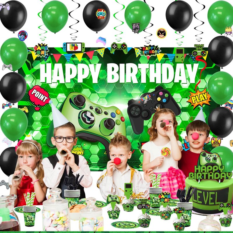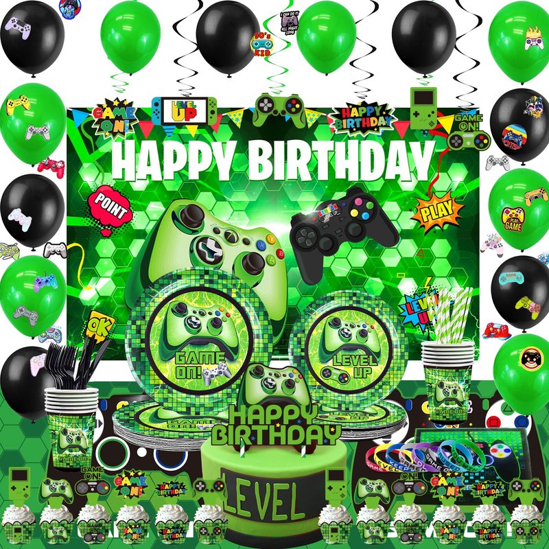 Green Gamer Birthday Party Decoration - 217Pcs Video Game Gaming Party Supplies For Boys Birthday Party - Backdrop, Table Cover, Plates, Cups, Napkins, Utensils, Hanging Swirls, Cupcake Topper, Cake