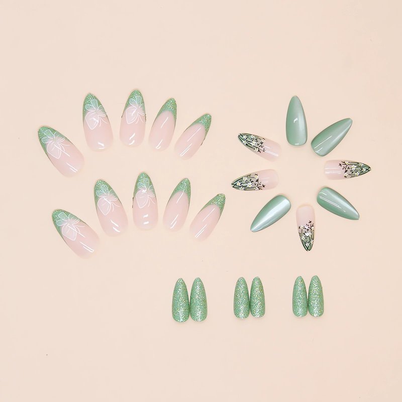 - 【Beautiful Design 】Our green press on nails almond flower are green flower and white butterfly design.The surface of the stiletto fake nails is glossy and thick, making it very comfortable to touch and irresistible.