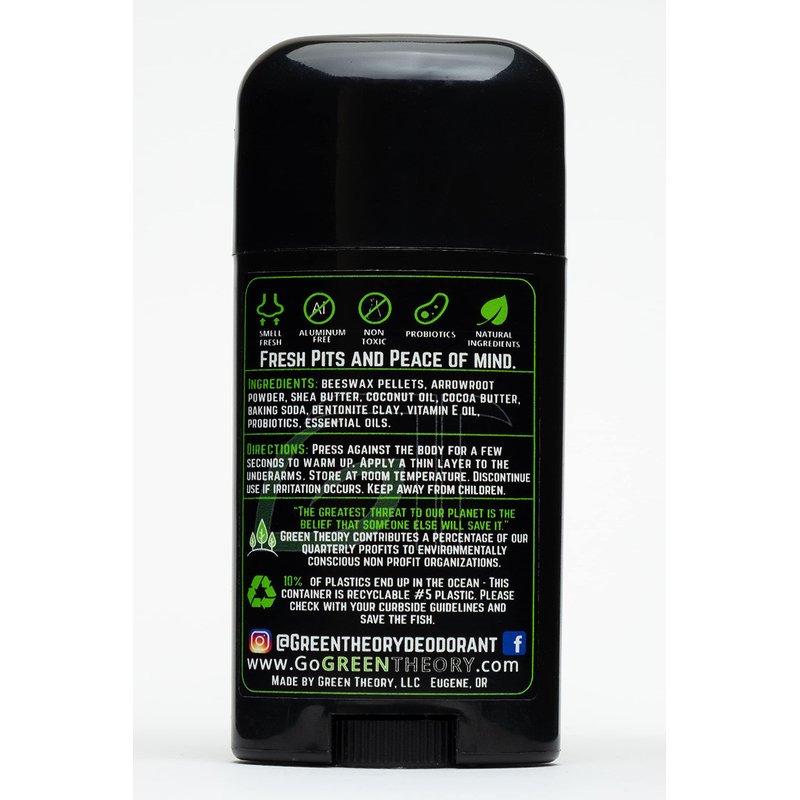 Specifically formulated for long lasting, high performance, odor free protection whether you're out in the woods, shooting hoops or just chasing greatness in your life. Green Theory offers 100% all natural probiotic deodorants thats leave you smelling as fresh as a cool fall day in the forest. Compare our ingredients to some of the other "natural" brands out there and see how many of their ingredients you know - no chemicals, no synthetic ingredients, no estrogen mimicking aluminum, no parabens....just all natural ingredients that work perfectly together. Only Green Theory products up the game and offer detoxifying bentonite clay so not only do you smell great but you're healthier from the daily detox. It's fresh pits and peace of mind. Made in Eugene, Oregon.