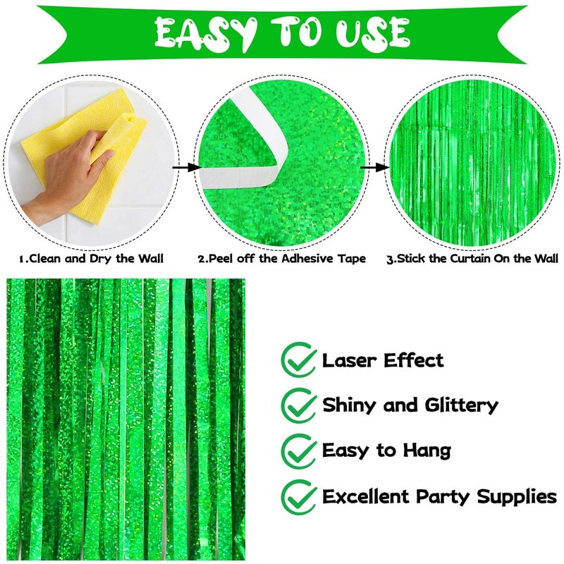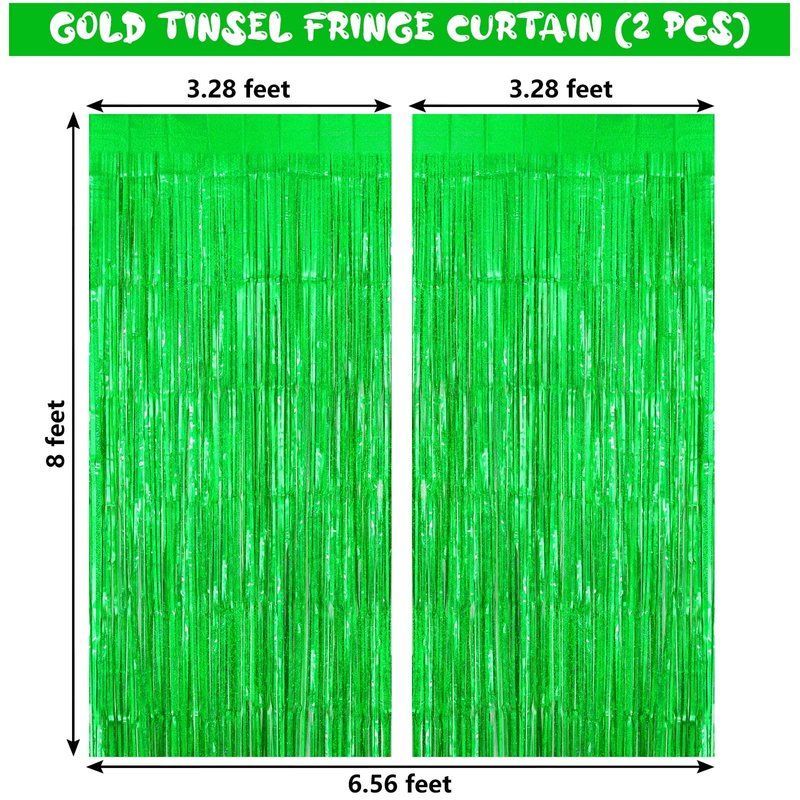 • PACKAGE CONTAINS: This package contains 2 pieces green tinsel fringe curtain, the size of each curtain measures approximately 3.28×8 feet, totally 6.56×8 feet. Ideal size and bright color are perfect for your party decor.