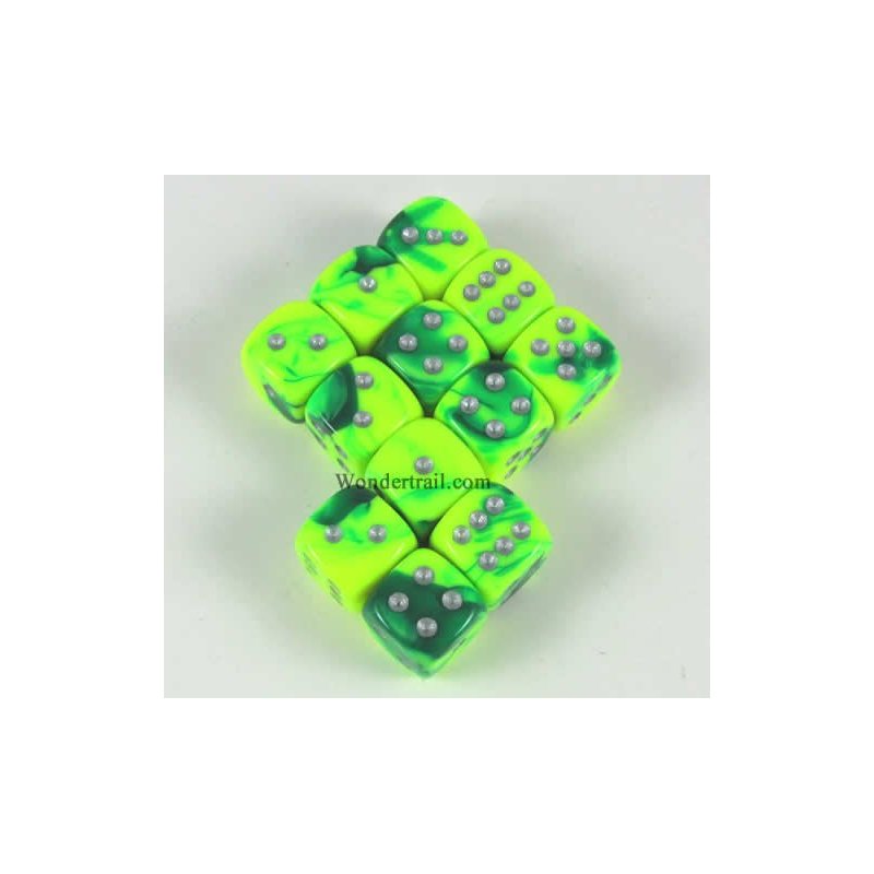 Green Yellow Gemini with Silver Pips 12mm D6 Dice Set of 12 Wondertrail WCX26854E12