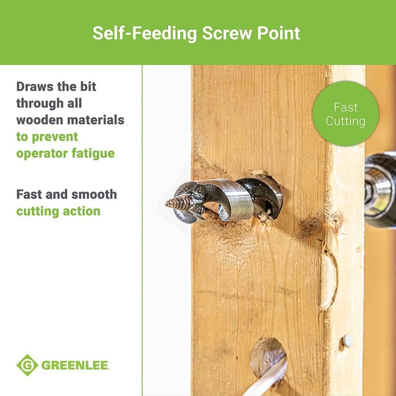 - SELF-FEEDING SCREW POINT: Innovative self-feeding screw point effortlessly draws bit through all wood types to lessen operator fatigue