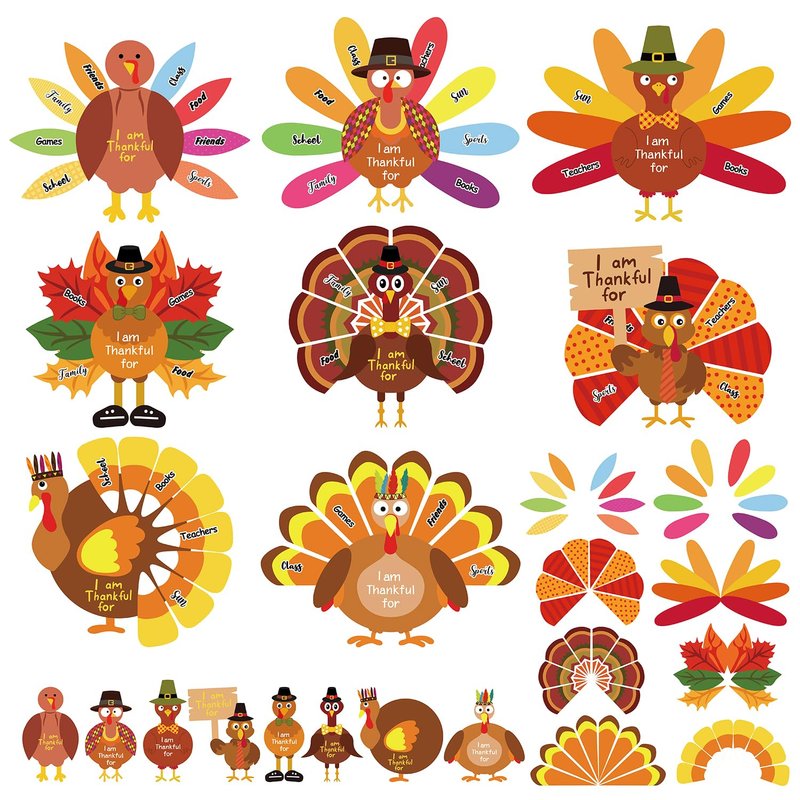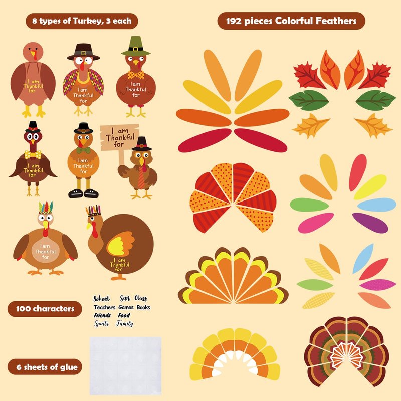 - 【Write Your Thanks】I am thankful' is printed on the turkey body, each turkey has 8 turkey feathers for different colored crafts, you can write your gratitude on each colored paper feather; These thanks giving crafts for kids are ideal for Thanksgiving Day