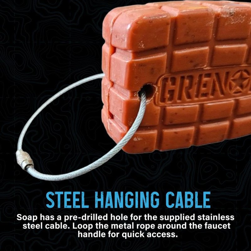 - STEEL HANGING CABLE Soap has a pre-drilled hole for the supplied stainless steel cable. Loop the metal rope around the faucet handle for quick access.