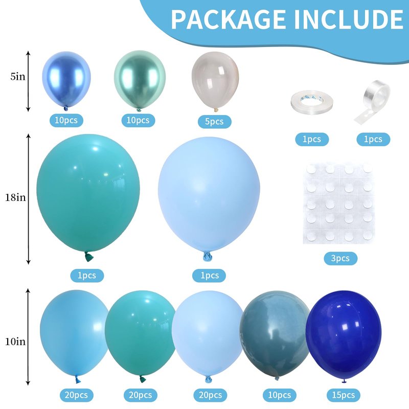 - 🎈【Assorted Blue Balloons Arch Garland Kit】GRESAHOM Ocean theme blue balloons arch kit is made of high-quality natural latex, more durable, super stretchy, and not easy to pop up. Both adults and children can use it safely. The set includes 112 exquisite balloons in teal blue, slate blue, royal blue, light blue, pastel blue, transparent, metallic blue and metallic dark green, ranging in sizes from 18, 10, to 5 inches.