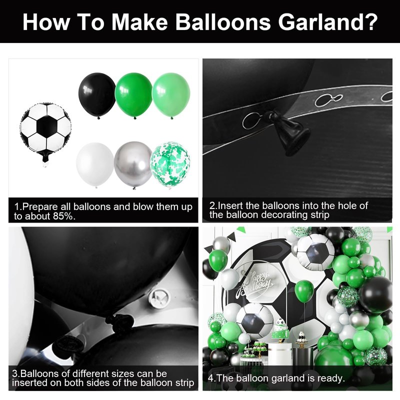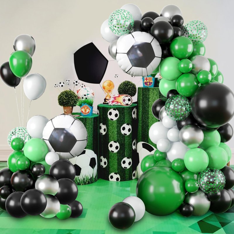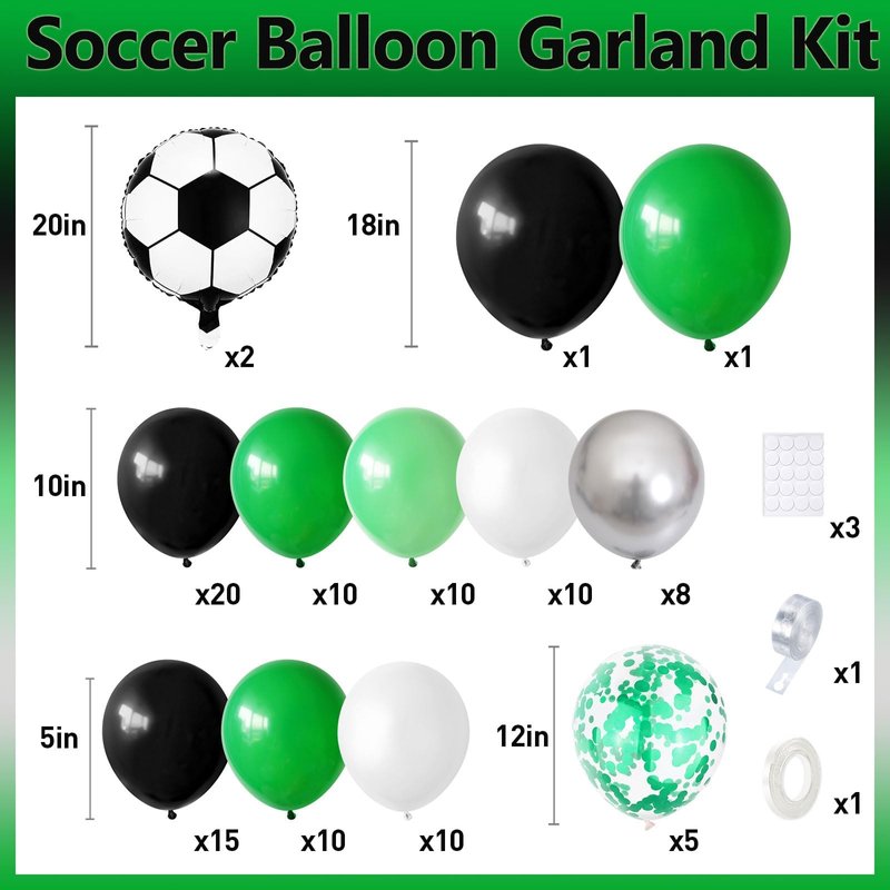 - 🎈【 Balloons Garland Kit】102pcs soccer balloon arch decorations set including 2pcs 20inch soccer foil balloons. 2pcs 18inch balloons(black x 1, green x 1). 5pcs 12inch green confetti balloons. 58pcs 10inch balloons (black x 20, deep green x 10, light green x 10, white x 10, metallic sliver x 8). 35pcs 5inch balloons(black x 15, deep green x 10, white x 10). With balloons strip, points sticker and ribbons, balloons different sizes help to create an exquisite balloon arch and balloons garland!