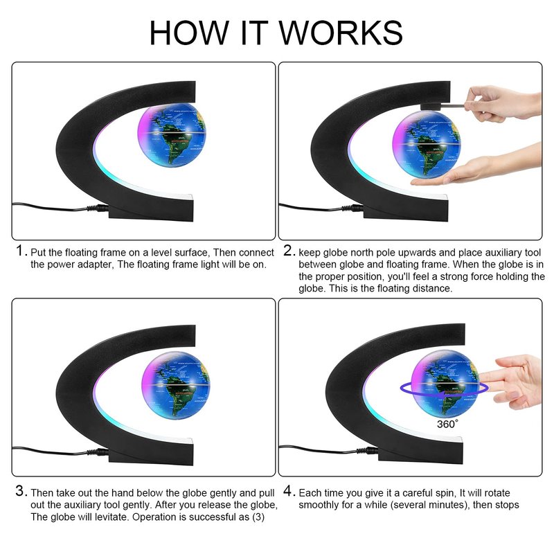 This is a Great desk decoration for home & office, and this is also an awesome high tech gadget. This high tech gadget comes with a LED lights feature that look cool when turned on in the dark. It is operated by an electronically controlled magnetic system. The gadget is simple to install. Once you get the gadget levitating, just give it a little spin with your finger and it will be rotating by itself for a while ( several minutes), then it will stops rotate. Specifications: Globe color: Deep Blue globe Adapter: US Plug Input: AC 100-240V~ 50-60Hz C shape Frame color: Matt black Warm Tips: the globe itself does not light on when it works . . This item only works plugged in . When it works, only the middle of the C shape frame lights up, the globe itself does not light up. . When you float the globe, please keep globe north pole upwards. . Please kindly be advised that the globe doesn't float centered/middle in the "C" shape frame, it floats closer to the top, please refer to the video on the seventh picture. You can refer to the video on the seventh picture about the actual object. Package including 1 * C Shaped frame 1 * Globe 1 * Adapter 1 * Auxiliary Tool 1 * User manual .