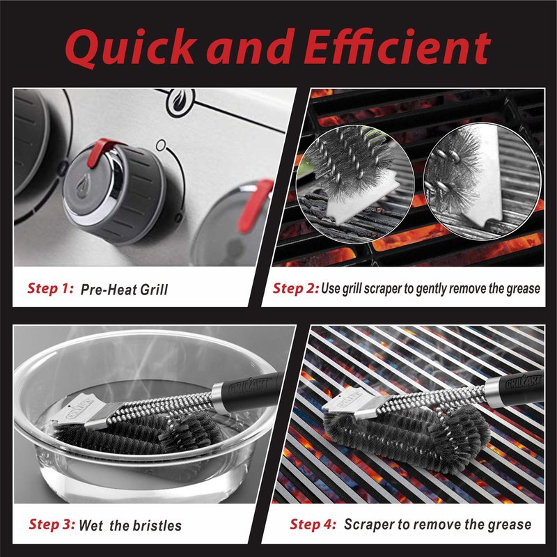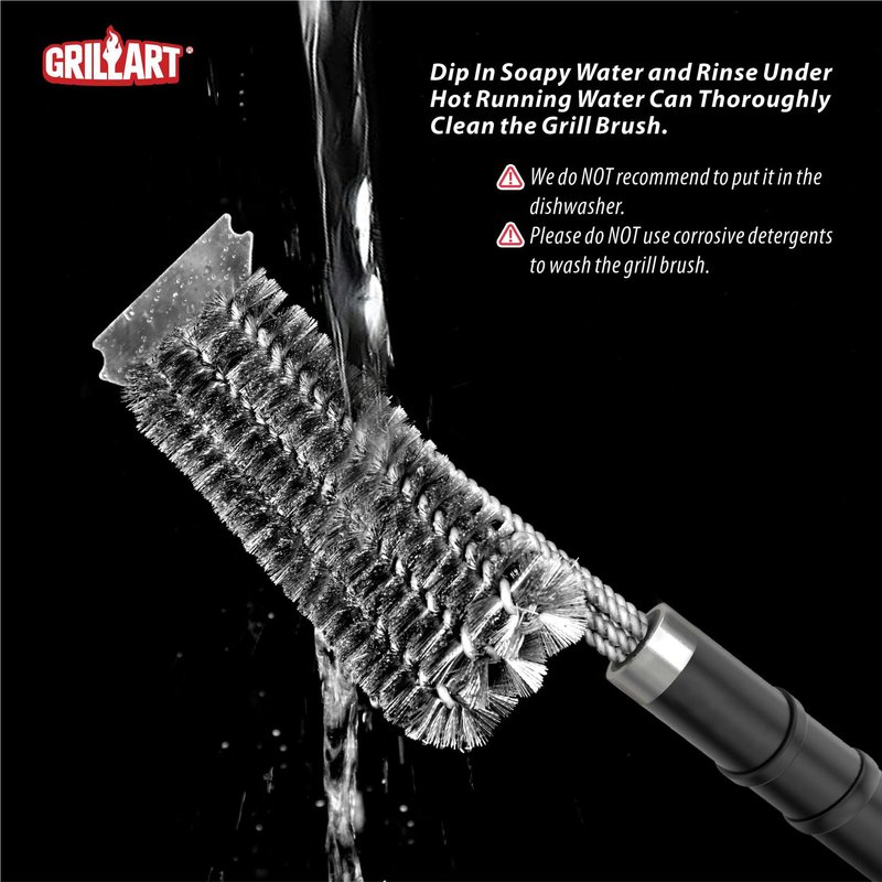 - Gentle Reminder: All grill brushes wear out eventually. For the sake of safety and health, after cleaning, use a damp cloth to wipe grill grates, preventing bristles from being left behind.