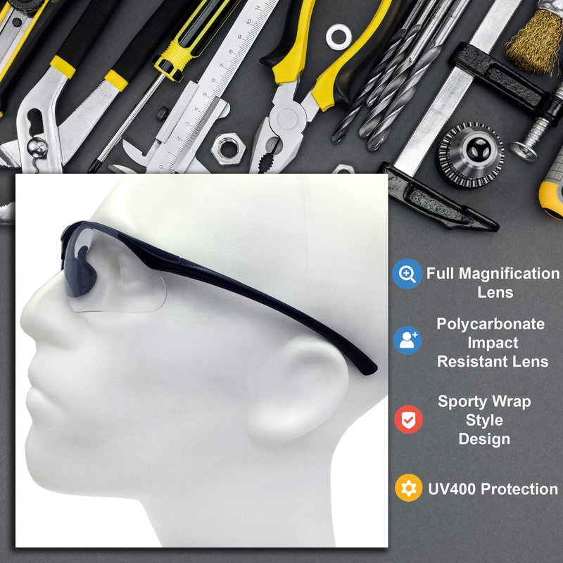 Full Lens Magnifying Reading Glasses Polycarbonate Impact Resistant Lens, ANSI Z.87 Certified 100% UV400 Protection Against Harmful UVA/UVB Rays Sport Wrap-Style Design with Flexible Rubber End Grips and Nose Piece for Secure Grip Increase Precision by Eliminating the Need for Adjustments Compared to Bifocals