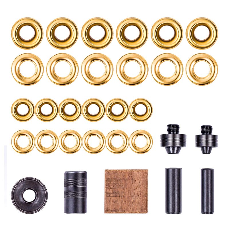 - COST-EFFECTIVE -- No need to buy another tool. Grommet kit set equipped with Six - 3/8" Grommets, Six - 1/2" Grommets, Universal Punch Body with Two Punch Heads (3/8" & 1/2"), Two-Sided Anvil (one side for 3/8'' grommet, another side for 1/2''), Two Hole Punches and hardwood backer block.