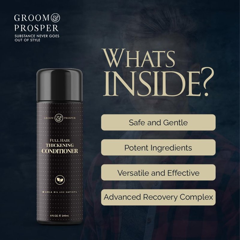Take your hair care regimen to the next level with the GROOM & PROSPER - Hair Thickening Conditioner for Men! This premium product rejuvenates hair, adding volume & reducing breakage. Loaded with beneficial ingredients like Capixyl, Biotin, Peptides, Argan Oil, Amla Oil, Aloe vera, & Green Tea Extract, it combats the follicle ageing process & prevents hair loss. Say hello to thicker, healthier hair. Benefits ✔ Stimulates Hair Growth: Packed with Biotin, our conditioner helps promote strong, healthier hair growth & reduces hair breakage. Feel the difference of voluminous hair after consistent use. ✔ Prevents Hair Loss: On a mission to save your locks? The power of Capixyl in our conditioner inhibits DHT production, thereby preventing hair loss & promoting thicker & fuller hair. ✔ Deep Conditions & Strengthens: Formulated with Argan Oil & Aloe vera, this conditioner deeply moisturizes & conditions your hair, leaving it smooth & shiny without stripping its natural oils. ✔ Antioxidant Properties: The Green Tea Extract in our conditioner acts as a powerful antioxidant for your hair, protecting it from environmental damage while promoting scalp health & hair growth. ✔ Anti-Aging: Slow down the hair aging process with our conditioner. Amla Oil & Peptides work together to combat follicle aging, enhance hair volume & increase hair density. Key features ✔ Advanced Recovery Complex: Our conditioner has an advanced formula that repairs & rejuvenates the hair from its roots, promoting healthier, stronger & shinier locks. ✔ Safe & Gentle: Made with natural & safe ingredients, this hair conditioner is gentle on the scalp & suitable for frequent use & all hair types, giving your hair a natural, healthy hair glow. ✔ Easy to Use: Apply this lightweight conditioner to wet hair, from midway down to your ends. Leave it on for a few minutes & rinse thoroughly. ✔ Potent Ingredients: Infused with Biotin, P