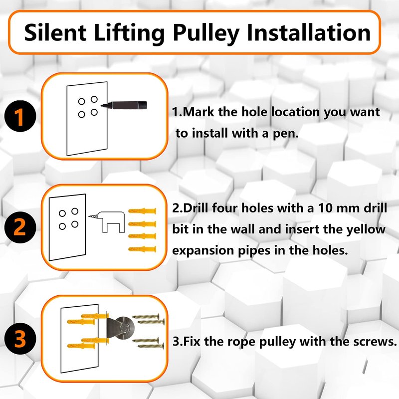 - ✅【Easy Installation】The pulley is designed for easy installation. You just need to mark the hole location, drill 4 holes with a 10 mm drill bit in the wall and insert the yellow expansion pipes in the holes, finally, fix the pulley with the self-tapping screws.