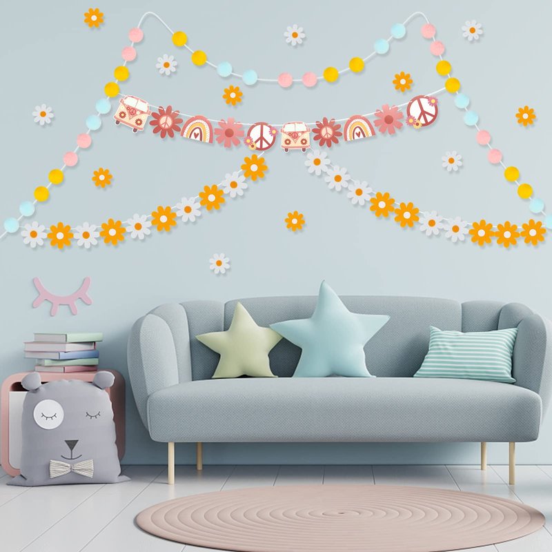 Groovy Party Decorations,4PCS Daisy Party Decorations,Hippie Boho Garland and Felt Ball Garland,Spring Daisy Party Supplies for Wall Window Home Room Decorations