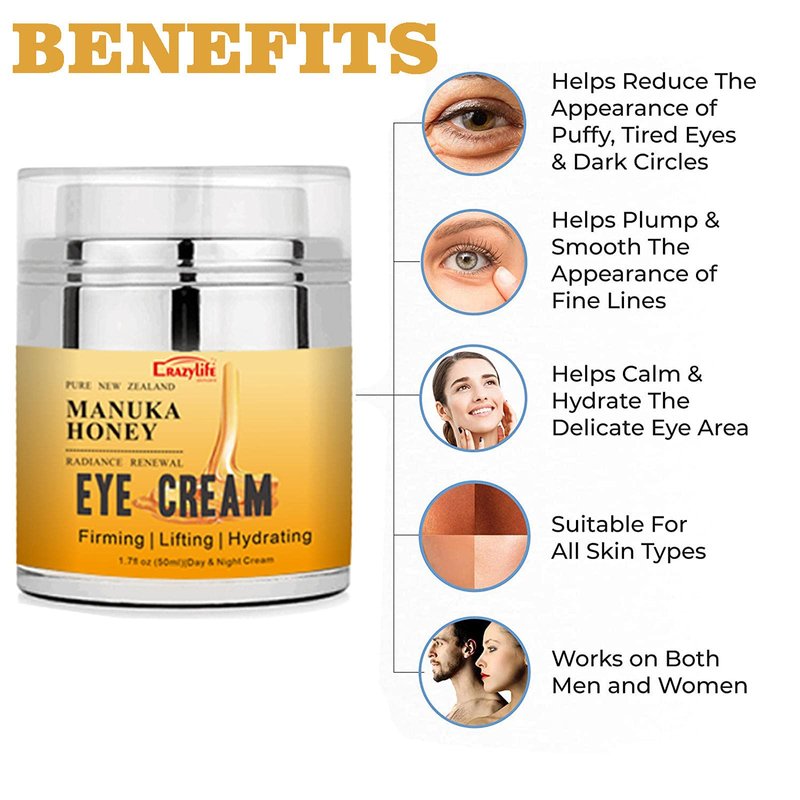 - 【Lasting results】Our Honey Eye Cream gives eyes complete anti-aging moisturizing protection all day and night. Addresses the most common frustrations associated with aging skin around the eyes (dark circles, puffiness, loss of firmness, sagging skin, wrinkles, crow’s feet, and dryness).