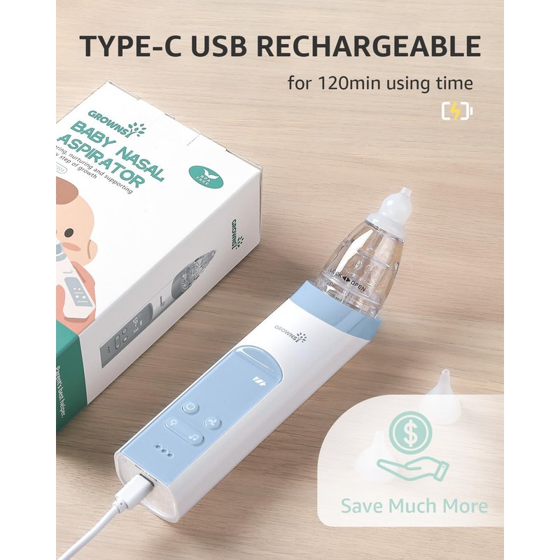 - USB RECHARGEABLE: The rechargeable baby nose suction can be used for 30 days after being fully charged. This lightweight baby nose cleaner comes with a storage case, it allows you to pack the aspirator and tips neatly or take it on any trip. Please use 5V Adapter.