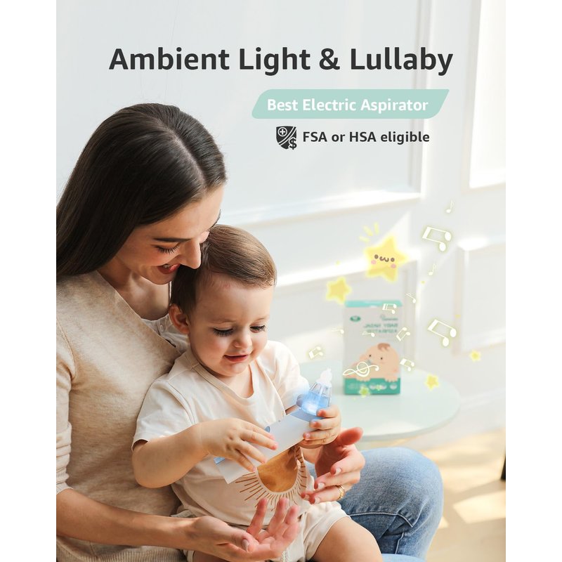 - INNOVATIVE DESIGN: We especially adopted light and music soothing function on the electric booger sucker, and with lower noise, which will make your baby enjoy this nose cleaning and make the cleaning progress easier and quicker.