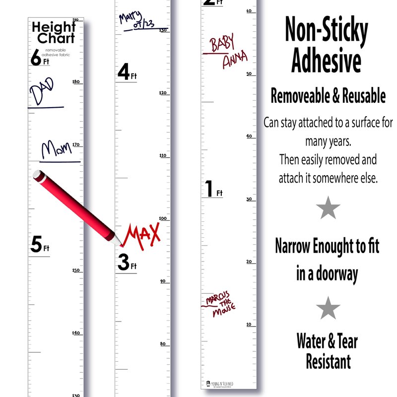 - Reusable growth chart decal: Adheres to most surfaces, no residue.