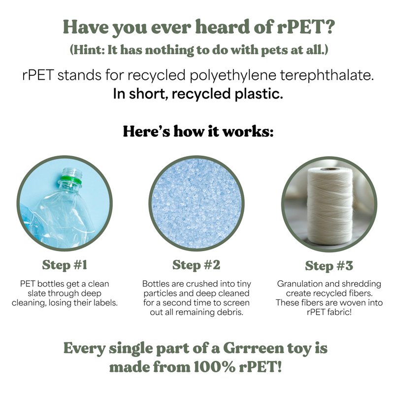 Do Good, Feel Good, Go GRRREEN: We all love to buy the best for our pets, but we don’t need to contribute more waste to this world. As an Intertek Green Leaf certified brand, we’re committed to making green practices go from far-fetched to totally paws-ible. Go GRRREEN and help us take a big bite out of plastic waste. Have you ever heard of rPET? (Hint: it has nothing to do with pets at all.) rPET stands for recycled polyethylene terephthalate. In short, recycled plastic. Every single part of this GRRREEN toy is made from 100% rPET, from the durable rope to the soft fabric exterior which is pet safe to play and chew all day and night!