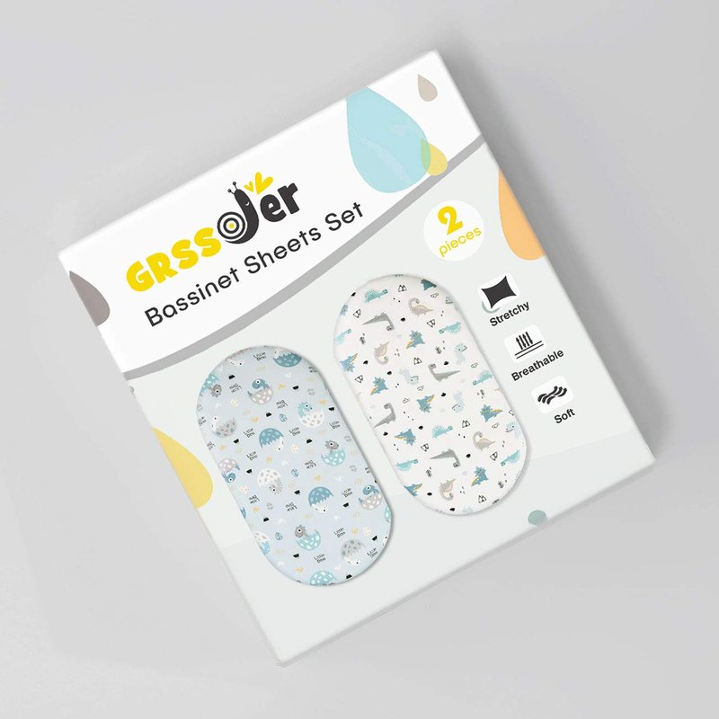 GRSSDER Stretchy Ultra Soft Fitted Bassinet Sheet Set 2 Pack, Universal Fit for Bassinets Baby Cradle Moses Basket Oval Rectangle Pad/Mattress, Happy Dinosaurs Bassinet Sheets for Girls and Boys