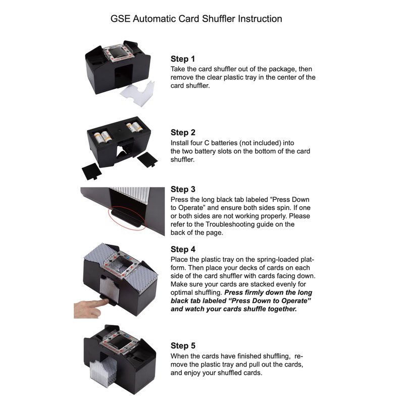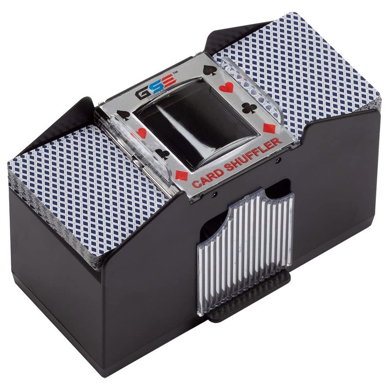 The GSE 4-deck automatic card shuffler made from high-quality ABS material, is a battery-operated electric shuffler that takes four C batteries (batteries are not included), 8.25''(L) x 3.75''(W) x 5''(H), portable and perfect for home, travel, outdoor camping. Our card shuffling can help you effectively shuffle the cards in a few seconds, up to 4 decks of cards, only 1-6 seconds, giving you more time to play games, which is very power-saving. A perfect gift for your father, father-in-law, the elderly, or people who like to play poker.
