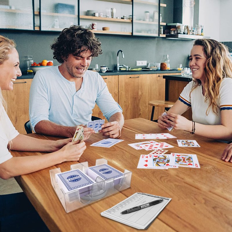 - What's Included: The canasta cards game set includes two decks of blue canasta cards, a playing card revolving tray, 50 canasta score sheets, and canasta game rules
