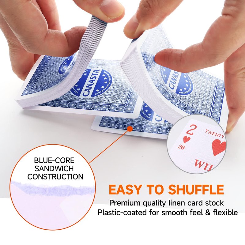 - Canasta Cards: The playing card is classic poker size, 3.5 x 2.5 inches, each card has printed point value and highlights on wild cards; made of blue-core paper for better stiffness, toughness, and folding resistance, plastic-coated for extra durability