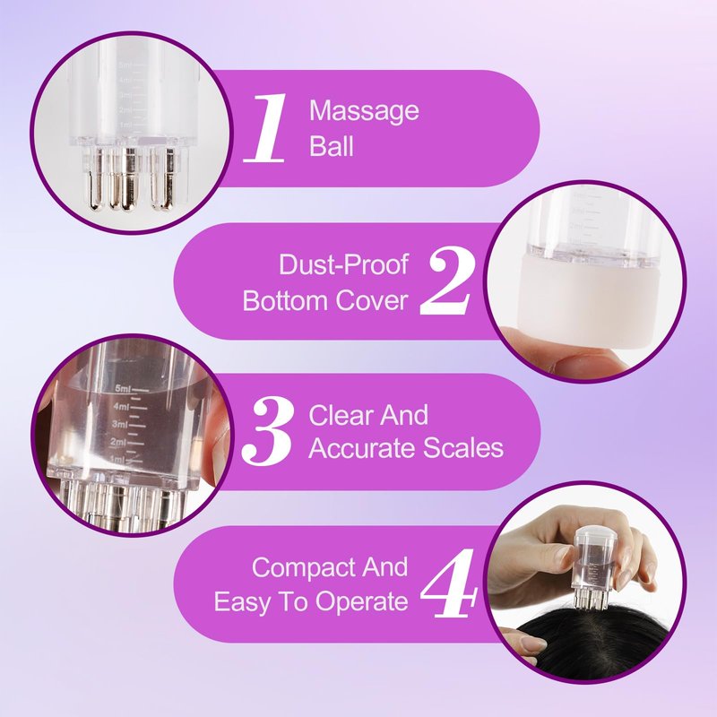 • Even Application: 5 discharge columns at the bottom of the applicator bottle , better fit the scalp, so that the essence, nutrient solution, essential oils, etc. Directly to the scalp, so that you are more comfortable and relaxed.