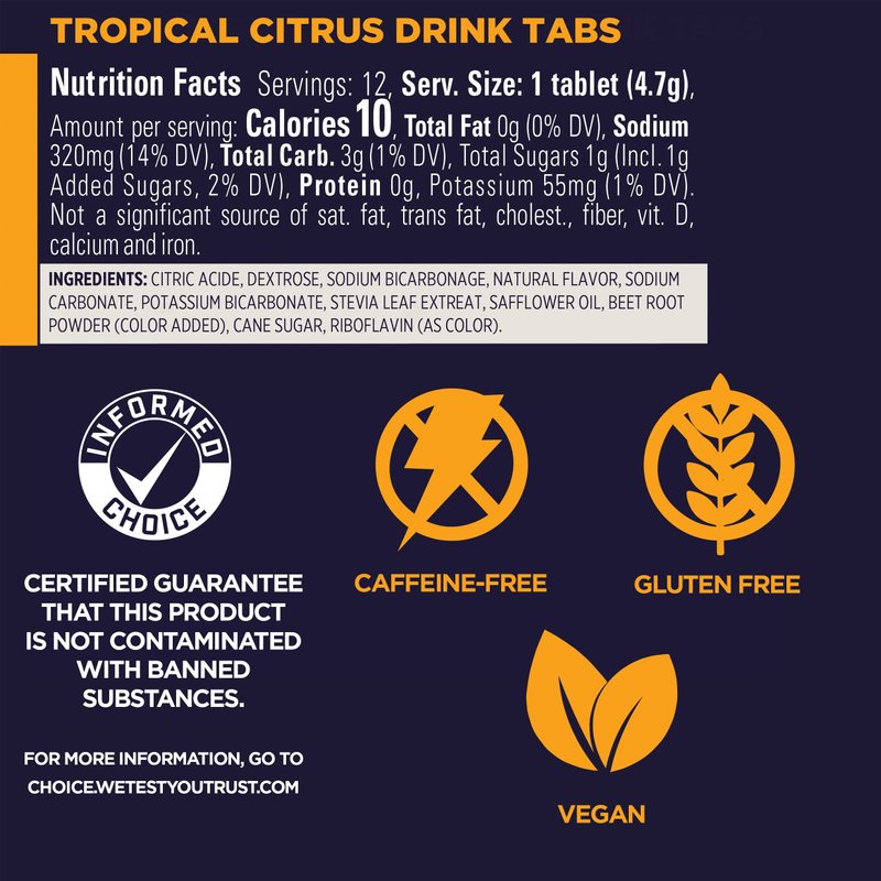 - Box includes 8 convient on-the-go portable tubes, each containing 12 Tropical Citrus tablets (96 total servings). Keep a tube in your gym bag, car, purse, luggage, or anywhere you'll want to replenish your hydration
