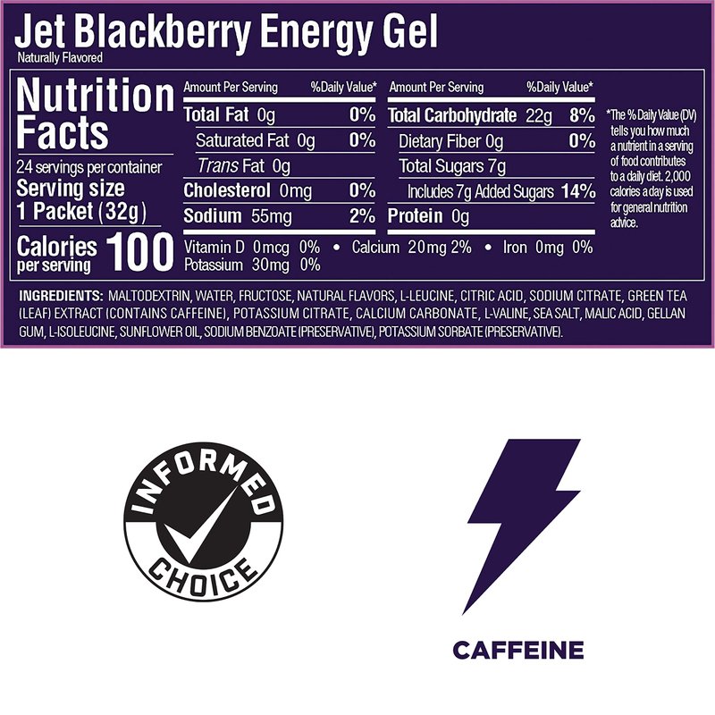 - Jet Blackberry contains 40mg Caffeine, 55mg Sodium, 30mg Potassium. Vegan and Gluten Free.
