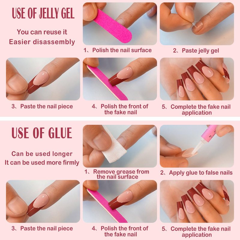 - EASY TO USE---you can use the complimentary jelly gel stickers (with nail gel stickers, fake nails can be reused). However, the jelly gel stickers are not as effective as liquid nail glue. If you want your artificial nails to last longer, you can use liquid nail glue, which lasts 1-11 weeks.