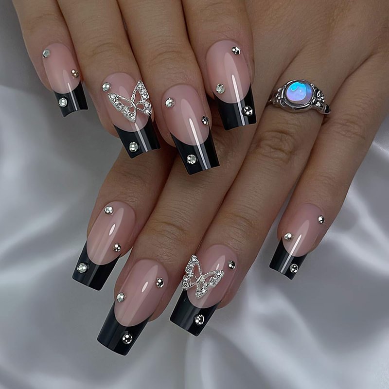 Gufonkod Black Press on Nails Medium Coffin French Tip Fake False Nails with Glue on Nails Butterfly Rhinestone Design Acrylic Nails Press ons Artificial Stick on Nails for Kids Women Girls 24PCS