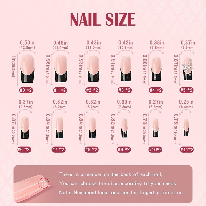 Black Press on Nails for Kids Medium Coffin French Tip Fake False Nails with Glue on Nails Butterfly Rhinestone Design Acrylic Nails Press ons Artificial Stick on Nails for Kids Women Girls 24PCS