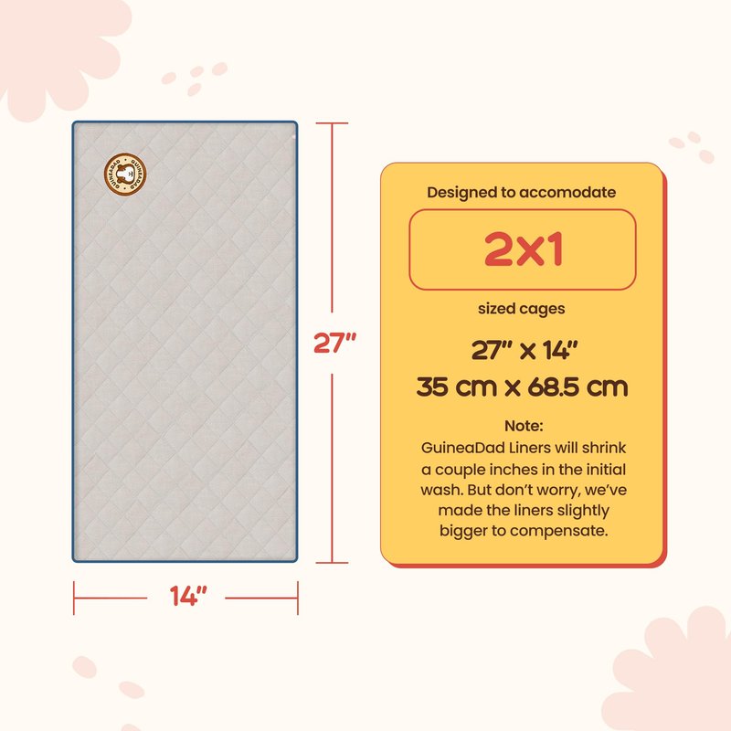 Because fleece fabric shrinks, GuineaDad guinea pig liners are made slightly larger than cages. After the first few washes, the liner will shrink to better fit the pen. Extra length can be used to cover the side walls and help guard against piggie pee.