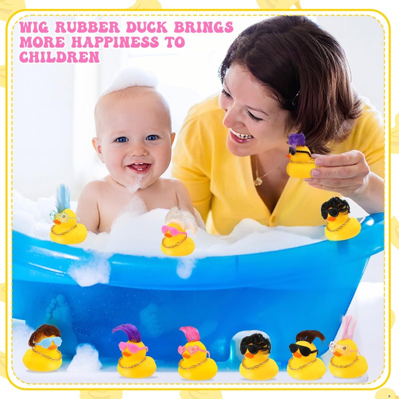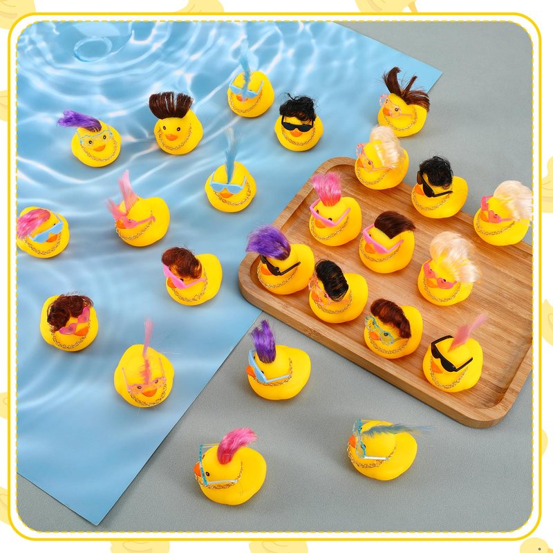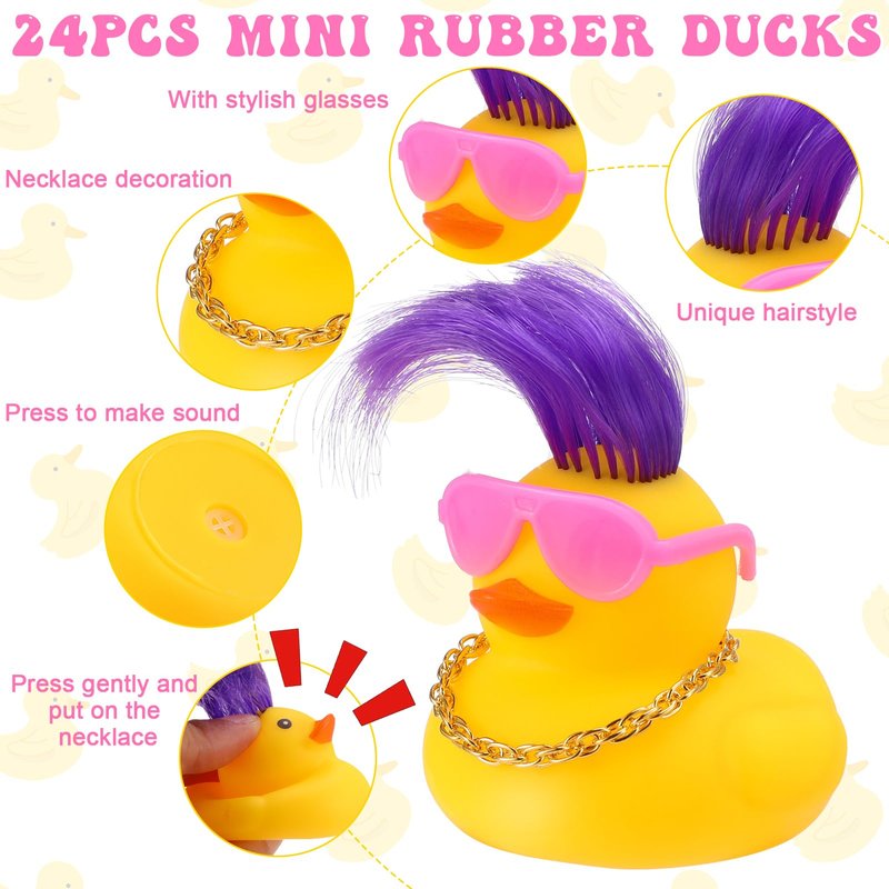 - Package Include: You will receive 24 sets of rubber ducks, including 24 small rubber ducks with wig in 8 styles, 24 mini sunglasses in 6 styles, 24 mini gold necklace. This mini rubber duck set is designed to suit your child's different preferences
