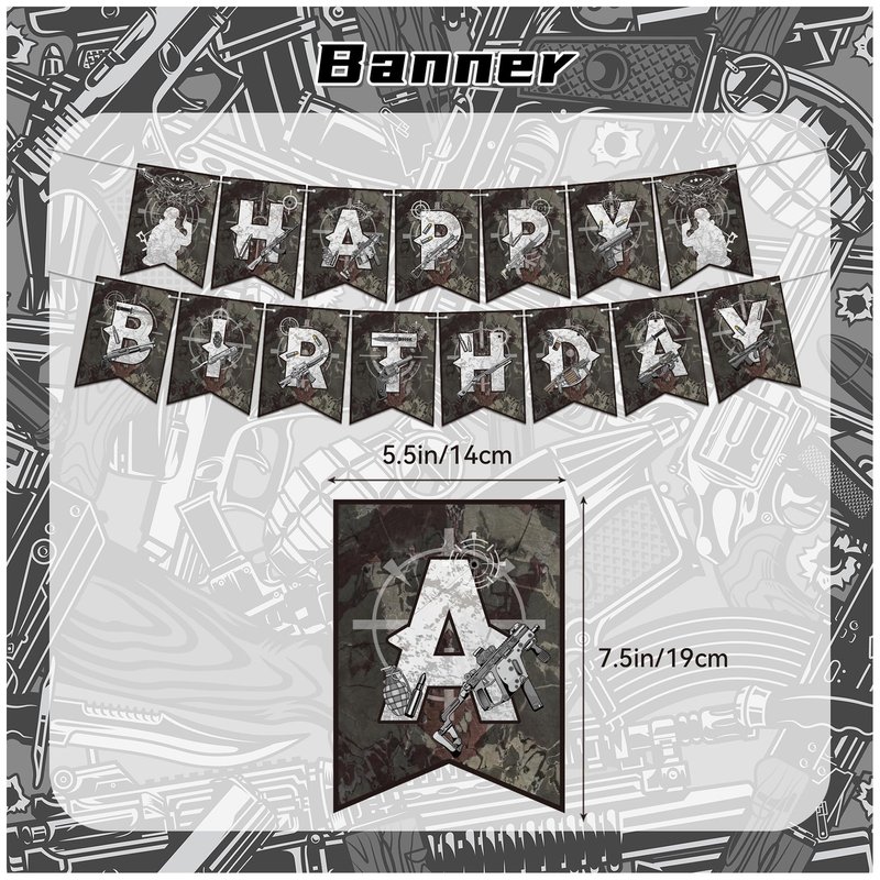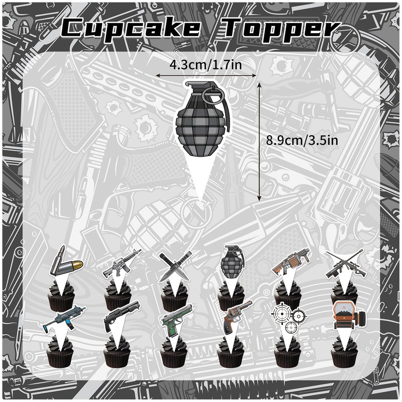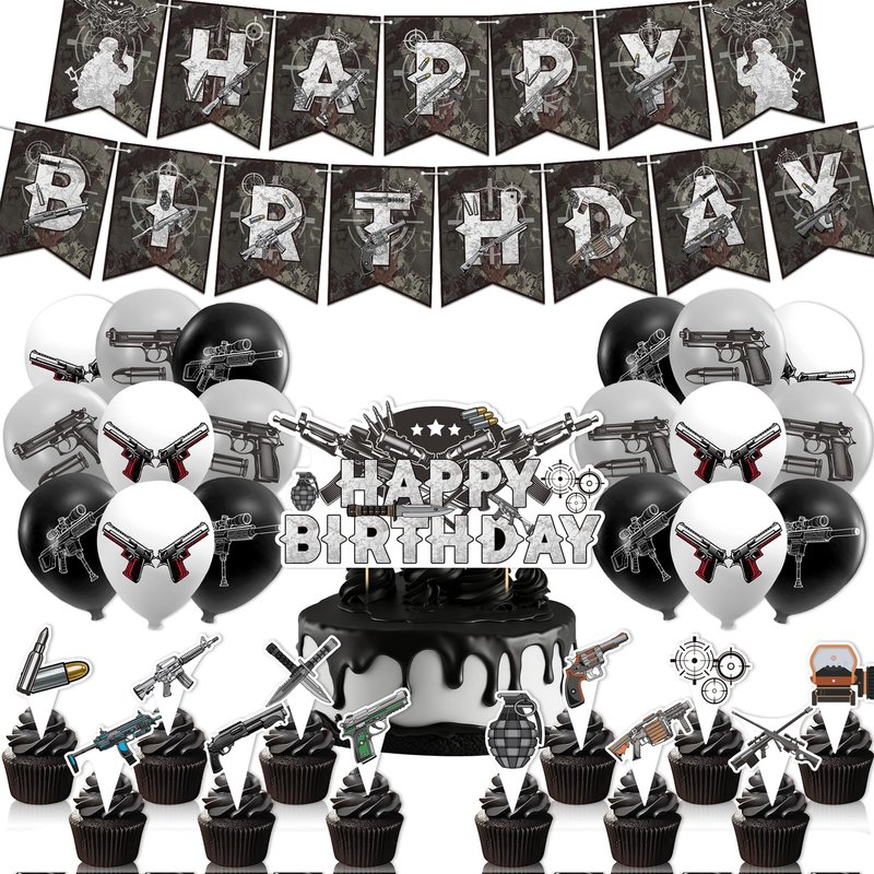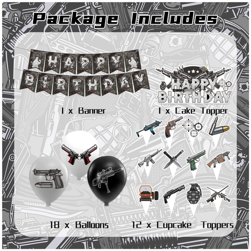 - Gun Birthday Party Decorations Pack: Our package contains 1 gun bullet target "HAPPY BIRTHDAY" banner, 1 gun " HAPPY BIRTHDAY" cake topper, 12 gun cupcake toppers, 18 gun latex balloons, 1 ribbon.