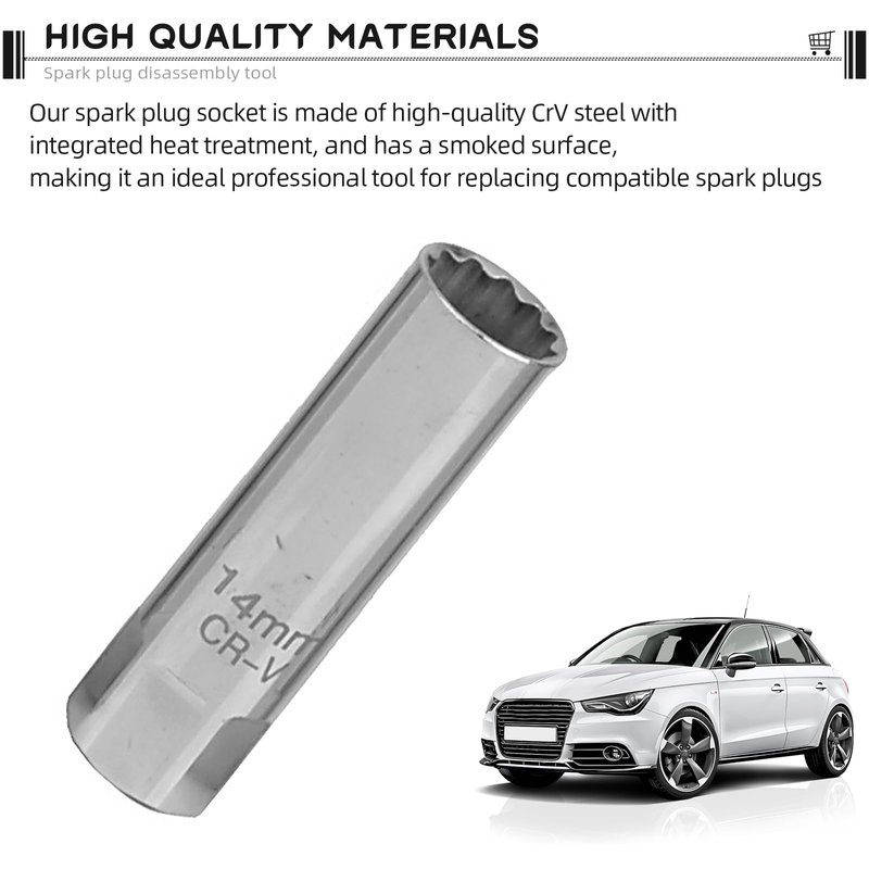 - Package Includes: You will receive 1 x 14mm spark plug socket, 12 point, 3/8" driver. Overall length is 3.8"/97mm, outer diameter 0.7"/17.9mm, gimbal helps the socket get into hard to reach areas and angles for extra flexibility and maneuverability, improving work efficiency.