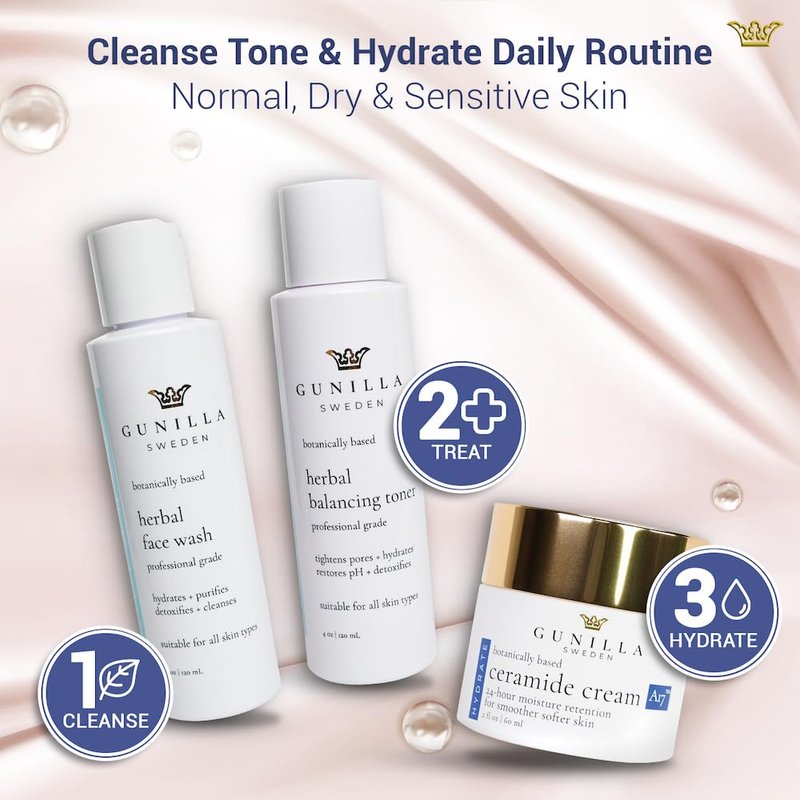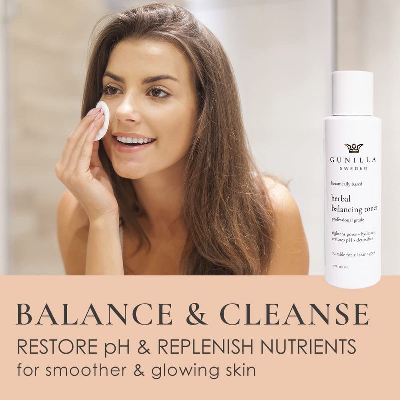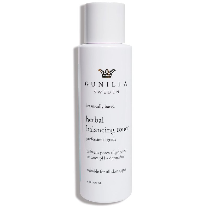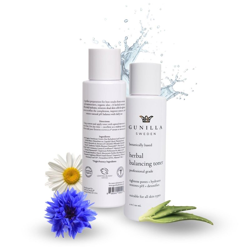 Toning is essential to smooth, tone, hydrate, and balance pH for the best skin possible! This nutrient-rich cleansing & and pH-balancing herbal toner is packed with over a dozen clinically proven, therapeutic, botanical, and antioxidant-rich ingredients and quickly cleanses debris and dead skin cells. It also helps reduce the appearance of pores without over-drying skin. This anti-aging facial toner gently hydrates, cleanses, and refines pores without over-drying the skinβs natural moisture barrier. Skincare professionals have used GUNILLA Herbal Balancing Toner for decades; itβs based on 60% hydroponic aloe vera, not water, is highly therapeutic, anti-aging, and free of alcohol, and astringents. Loaded with Baltic sea kelp, Linden Tree, St. Johns-Wort, Witch Hazel, rosemary, and more, our toner adds radiance and glow to all skin types.