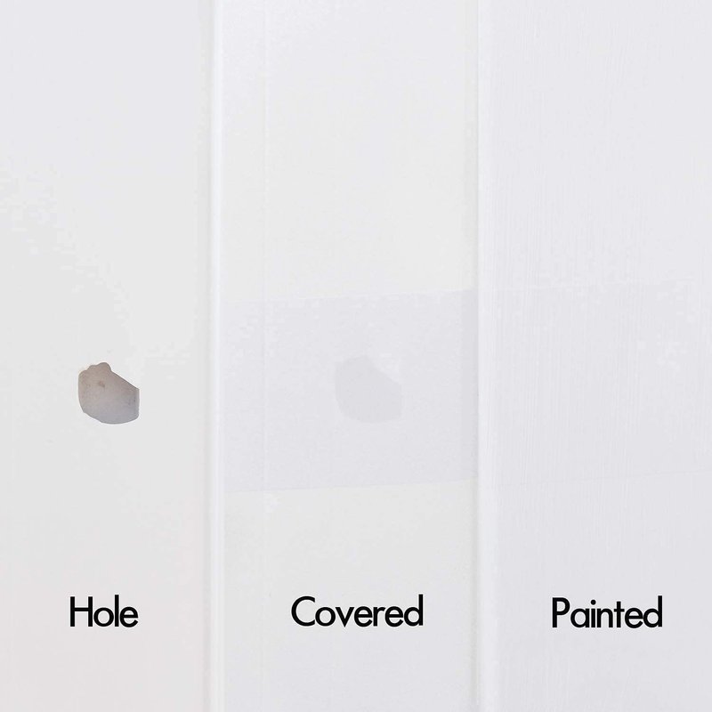 Step 4 — Covering. Peel the backing paper and apply to siding, pressing patch from one side to the other in case of bubbles and you will see the woodgrain pattern will appear.