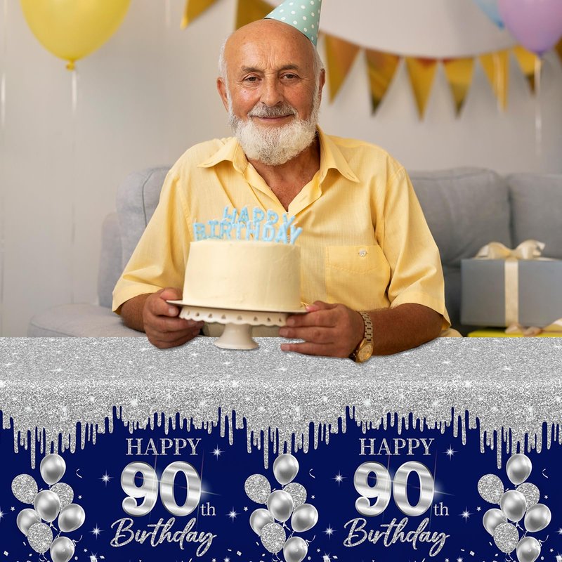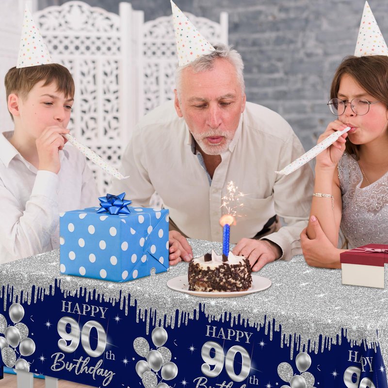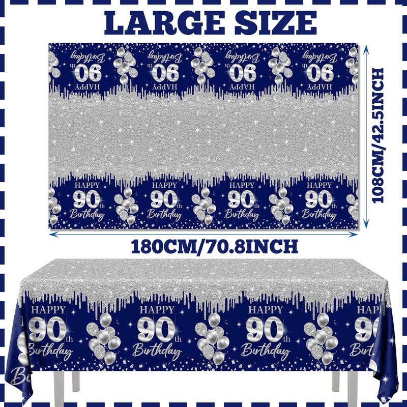 - WIDE APPLICATIUON:It is the wonderful 90th birthday decorations blue . Blue happy 90 birthday table cover can be used for 90 birthday party supplies,90th birthday decorations for men,90th birthday table decorations dessert tables, tables, display racks, camping, picnics, etc.This sliver and blue birthday 90th tablecloth will surprise all people away!