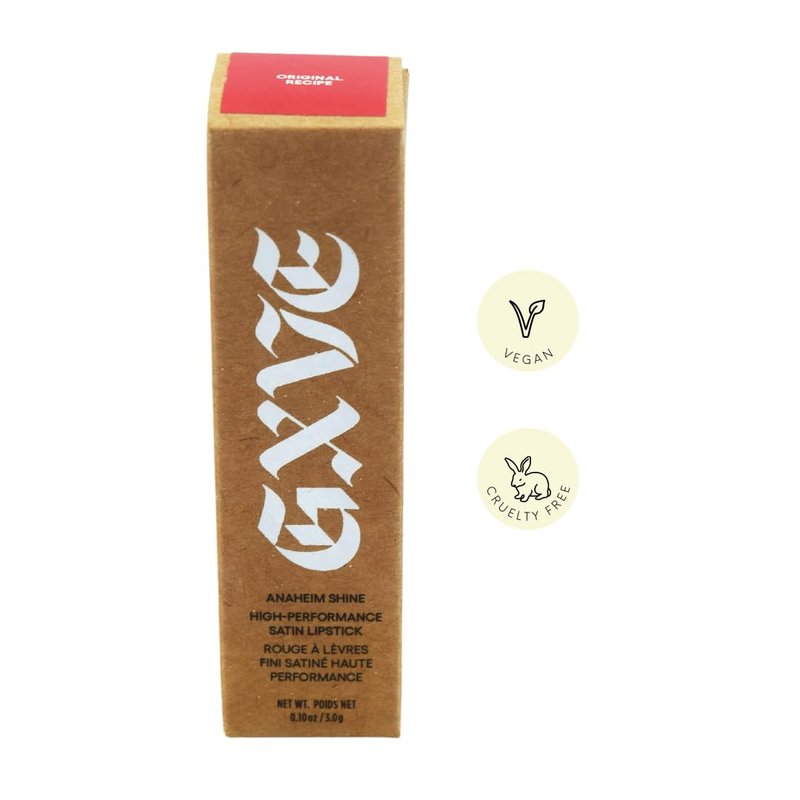 GXVE BY GWEN STEFANIAnaheim Shine Clean High-Performance Satin LipstickColor: Original Recipe - true redSize 0.10oz 3gA cushiony, high-performance lipstick with high color payoff and a smooth-as-silk satin finish.Get Gwen’s signature lip with this high-performance lipstick in a high-shine satin finish. Enjoy richly pigmented, stay-true color in one swipe with a silky, cushiony formula that glides on smoothly and grips lips to stay in place, wearing comfortably. How to Use:-Beginning at the center of your lips, swipe on and work toward outer corners.-Use the pointed tip to perfect.All GXVE Beauty outer boxes are 100% recyclable. Our primary containers are made with sustainable materials, including 30% or higher PCR (post-consumer recycled) plastic or glass.