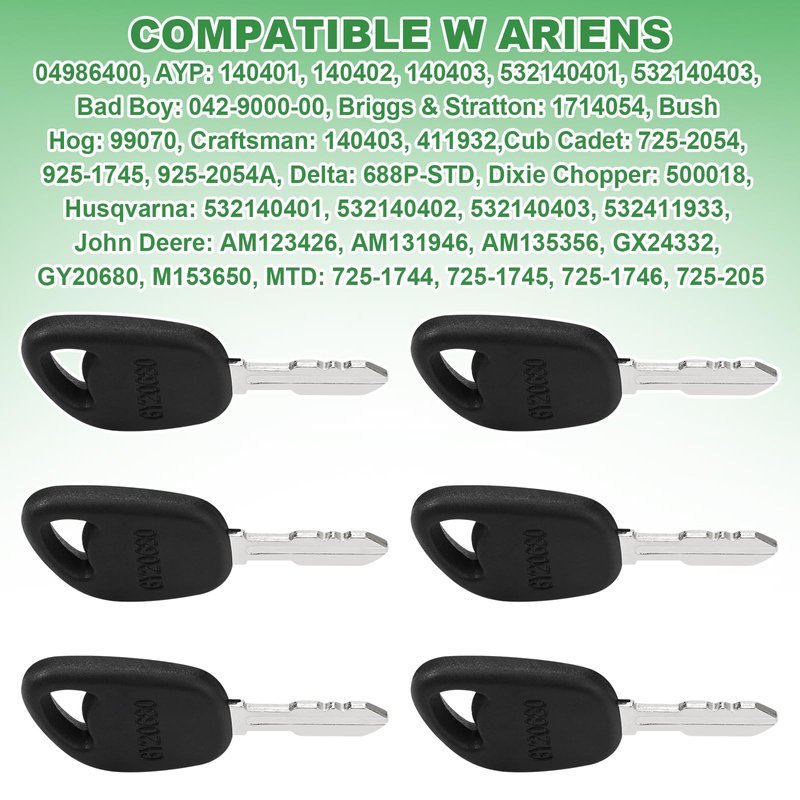 Comapatible w/ Ariens: 04986400, AYP: 140401, 140402, 140403, 532140401, 532140403, Bad Boy: 042-9000-00, Briggs & Stratton: 1714054, Craftsman: 140403, 411932, Delta: 688P-STD, Husqvarna: 532140401, 532140402, 532140403, 532411933, 539107544, John Deere: AM123426, AM131946, AM135356, AM135345, GY20680, M153650 An aftermarket Ignition Switch Key with a heavy duty Key Ring for daily use. Please check the product images to make sure you are ording the right parts. For John Deere JD mowers Troy Bilt Craftsman Toro lawn tractors, riding mowers, zero turn mowers. Comes in 2x key with a Key Chain in nylon package.