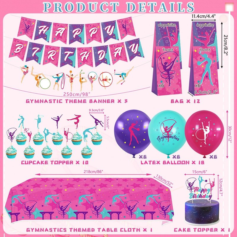 - Gymnastics Birthday Party Decorations: Planning a fun and lively gymnastics-themed party with our gymnastics party supplies, which includes a happy birthday banner, cake and cupcake toppers, gift bags, tablecloth, and balloons in 3 different styles. She will be surprised and impressed with your unique party