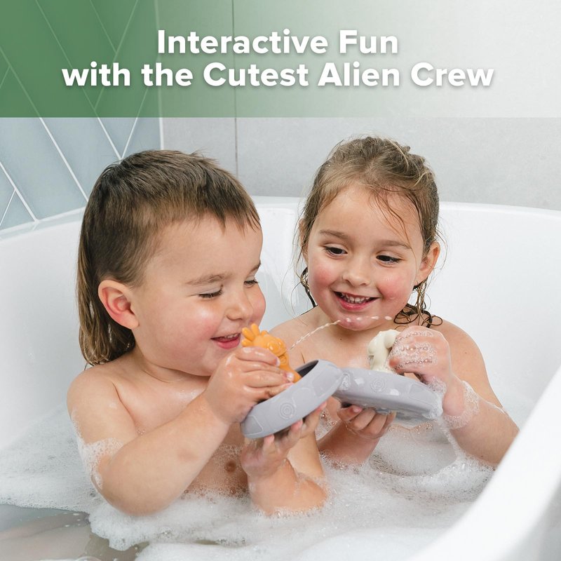 Get ready to meet the Alien Explorers! This adorable toddler bath toys set is designed to pull apart for easy draining, cleaning and drying! And because they're made of soft, non-toxic food-grade silicone, each tub toy is safe on your baby's skin and in the water.Crew members Tympani, Nova,Jupiter, Bumble and Dux, along with their ship, the Constellation Express, are perfectly sized to let little hands spray water with a simple squeeze for endless entertainment. In the bath, the pool, at the beach or just as an everyday toy, this set is truly magical!