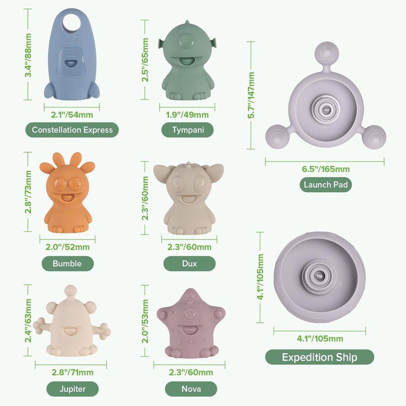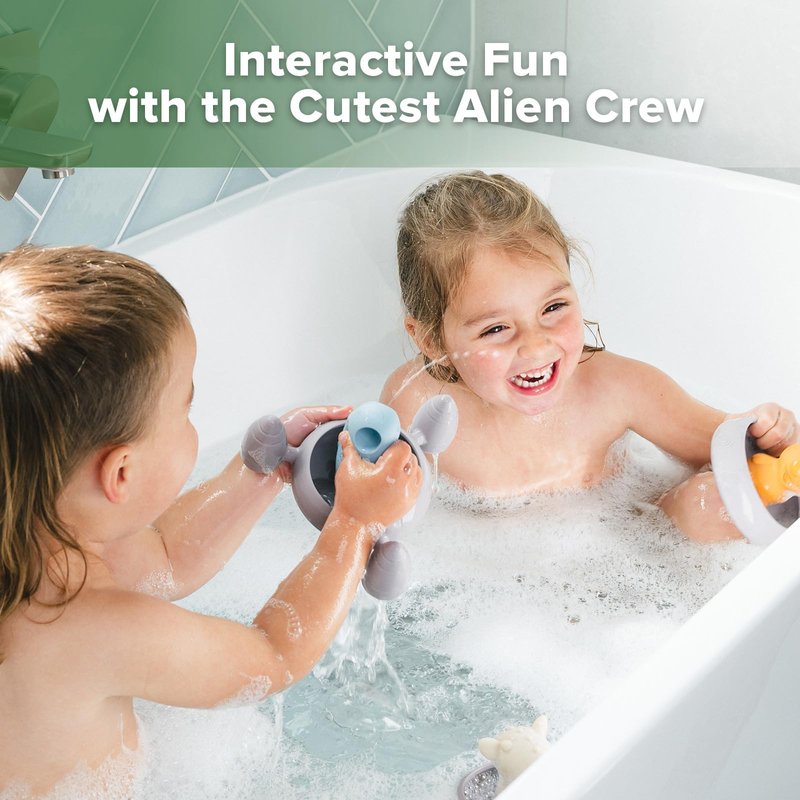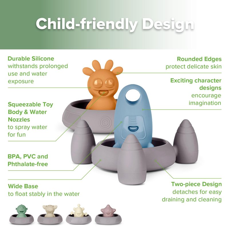 Get ready to meet the Alien Explorers! This adorable toddler bath toys set is designed to pull apart for easy draining, cleaning and drying! And because they're made of soft, non-toxic food-grade silicone, each tub toy is safe on your baby's skin and in the water.Crew members Tympani, Nova,Jupiter, Bumble and Dux, along with their ship, the Constellation Express, are perfectly sized to let little hands spray water with a simple squeeze for endless entertainment. In the bath, the pool, at the beach or just as an everyday toy, this set is truly magical!