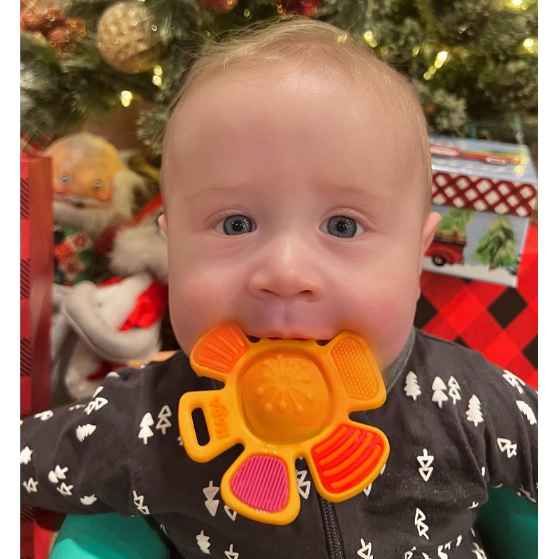 - Measures about 3" in diameter. Made of silicone, it is very soothing for teething babies